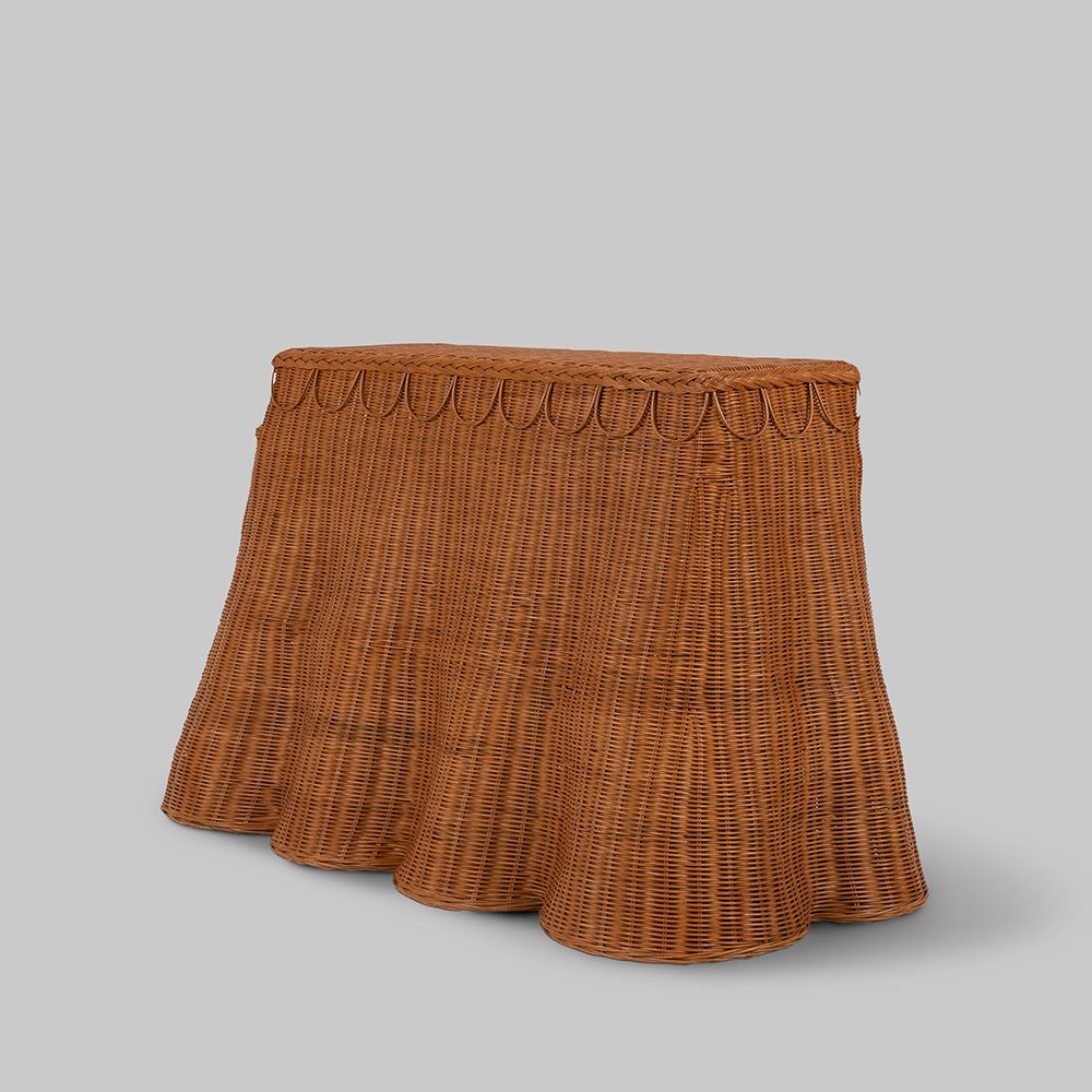 Featuring Sharland England’s signature braiding and loops, the Adeline console table is sophisticated and yet still cozy. Handwoven curves flare out at the base like a tablecloth inspired by vintage rattan furniture showcasing a technique named trompe l’oeil drapery, giving the silhouette a very feminine, elegant feel. The back is straight to sit flush against a wall or back of the sofa. Also available to order in a larger 55"W (top) x 67"W (bottom) x 19.75"D x 31.5"H.