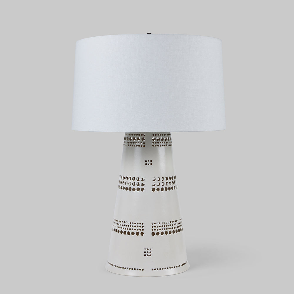 Ceramic table lamp by Ryan Mennealy that spells out "Love is Love" in Morse code. Includes interior light inside the body of the lamp to highlight the pattern. Pair available.