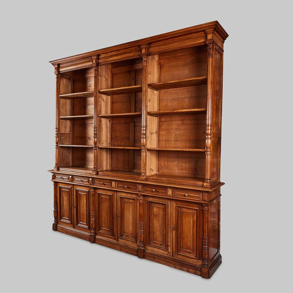 A stunning large-scale two-piece bookcase with adjustable shelves in the top and closed storage below. Includes nine shelves for the upper cabinet, three shelves for the closed cabinet, and three keys. Dimensions given are for the piece together. The base measures 39"H and the top is 69"H.