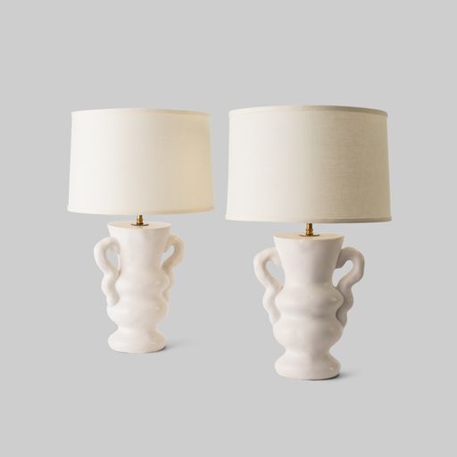 A pair of 'Ysolde' table lamps by Dorian Caffot de Fawes. Hand cast in London, polished and waxed high quality plaster. New linen drum shades. Dimensions given are at the shade. The body of the lamp base measures 9.5"W x 6.25"D x 12"H. Can be purchased individually.